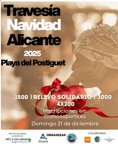 Este evento combina deporte, solidaridad y tradición, reuniendo a nadadores de todas las edades en un ambiente festivo y navideño. Los participantes podrán elegir entre dos distancias —1.500 y 3.000 metros— o sumarse al Relevo Solidario 4×200 m (categorías masculina, femenina o mixta), cuya recaudación se destinará a ASPANION, la asociación de padres y madres de niños con cáncer de la Comunidad Valenciana.